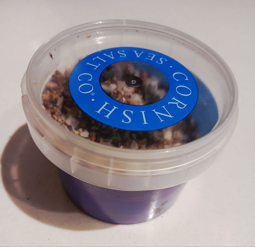 So whilst in the supermarket, I’ve bought myself a little pot of salt and pepper so that I can pinch out of the tub and know how much I’m dealing with.